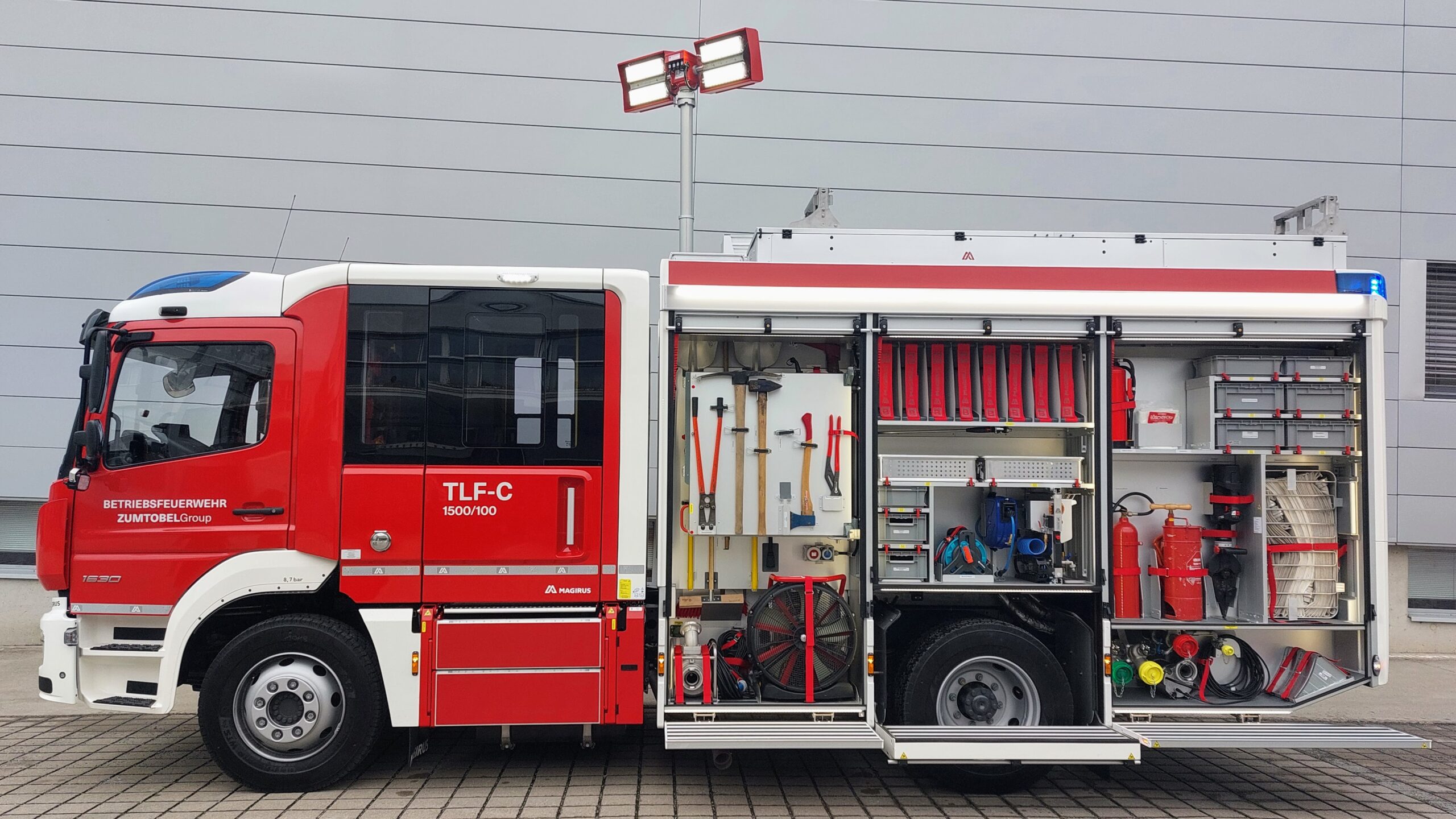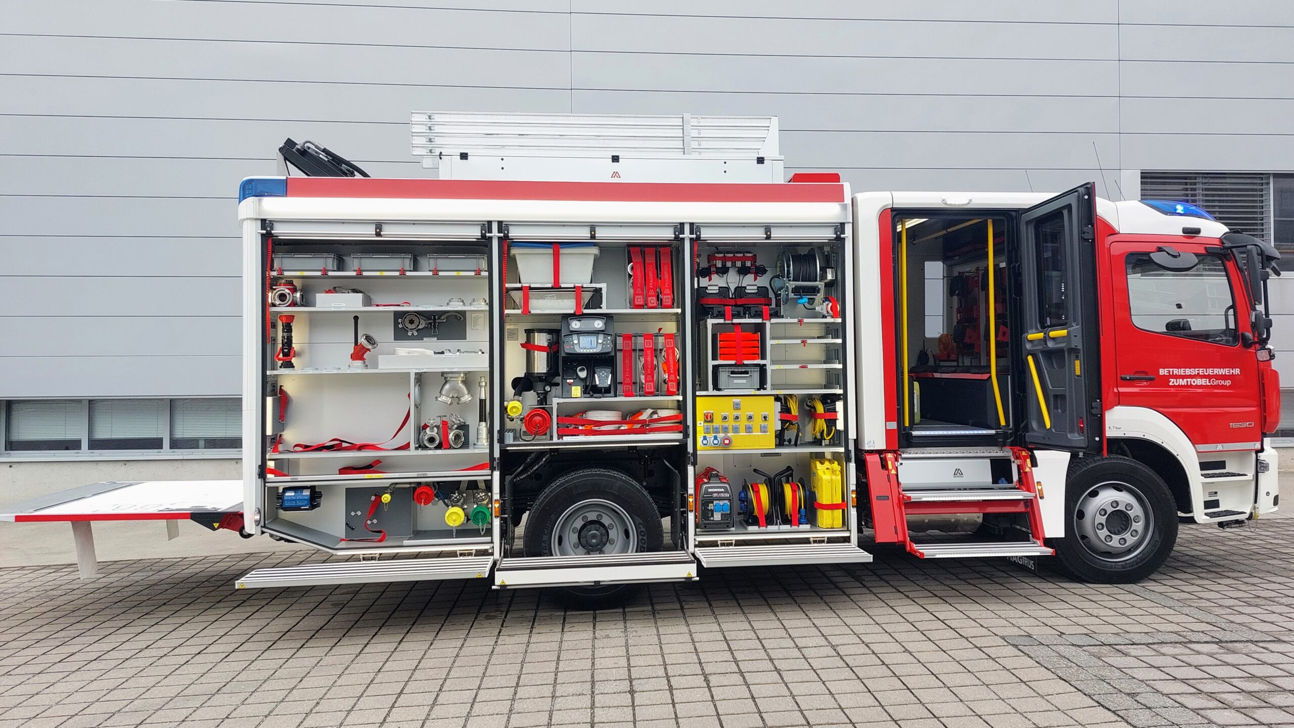 • Ladebordwand – Ladefläche für 2 x RC, Einbaupumpe – Bedienung im GR4, Einbaugenerator 15kVA im GR2 – Bedienung über das HMI im GR4, Wasser-Schaumschnellangriff Fahrzeugfront (Bedienung über HMI im Fahrerhaus) sowie Schaumschnellangriff im GR4, Wasser-Schaumabgänge im Unterbaukasten linke und rechte Seite