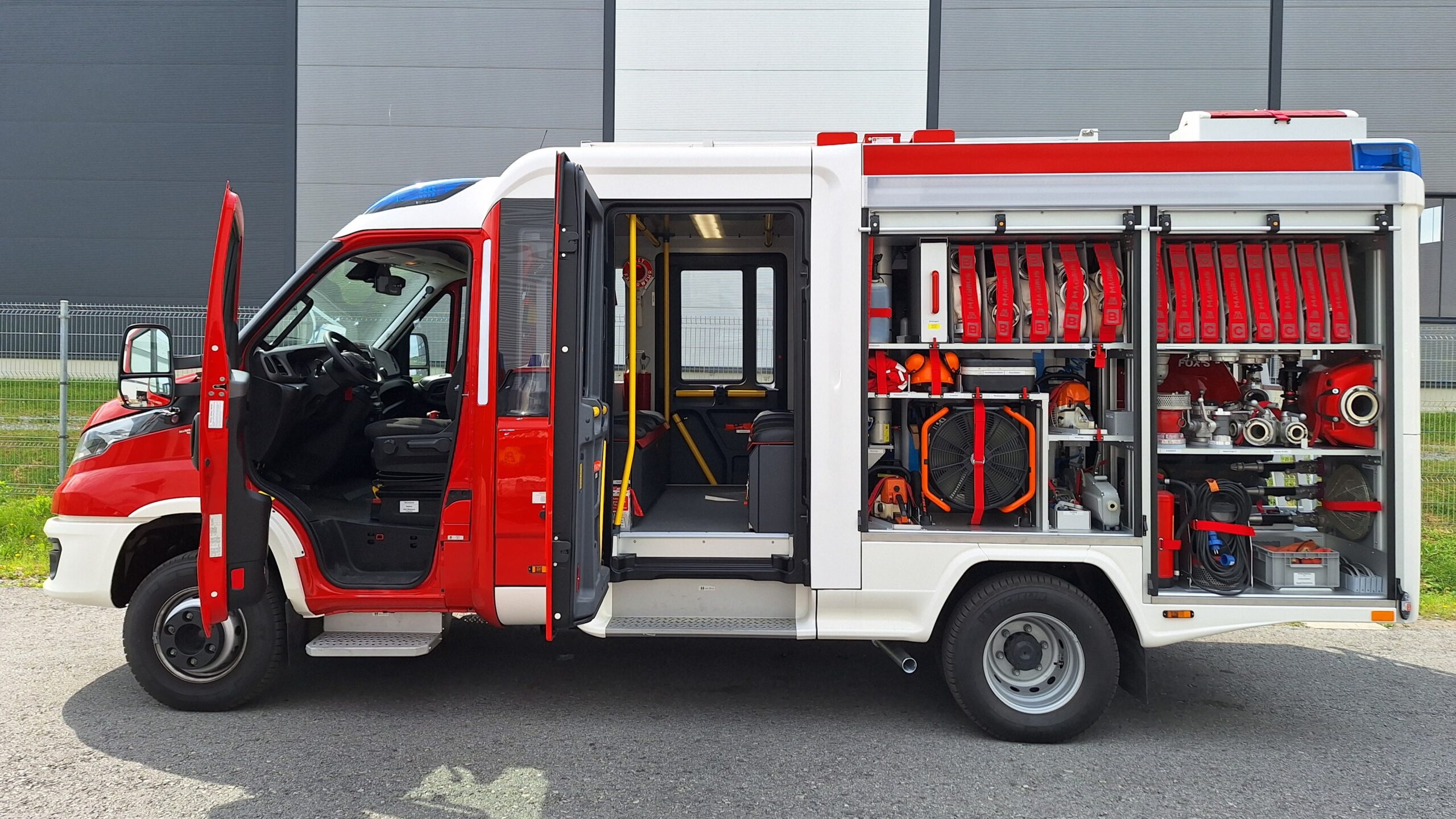 - Im Heck eine auszieh-absenkbare Auszugsschiene für eine Tragkraftspritze , Druckbelüfter im GR1, im GR2 befindet sich der Pumpenbedienstand / HMI sowie Abgang B, Füllleitung für den Wassertank und Saugeingang A110, Auszugsschiene im Heck für Schanzwerkzeuge