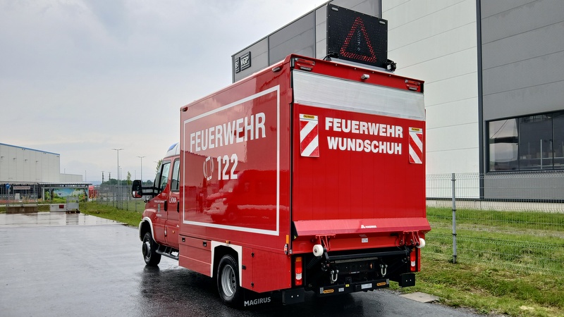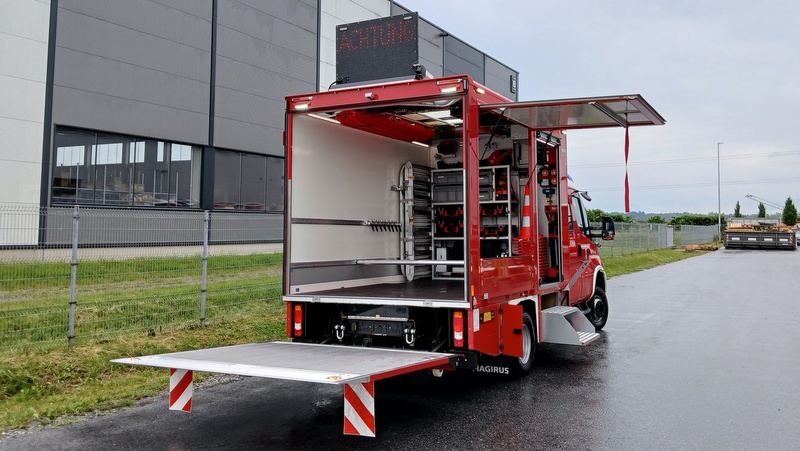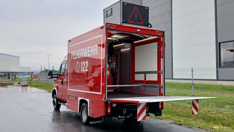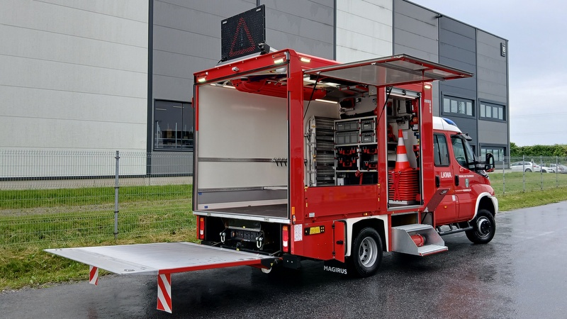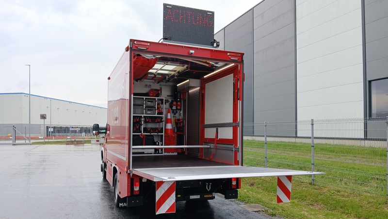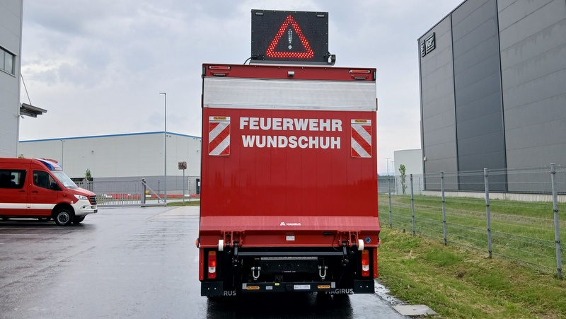 - Ausklappbare Verkehrsleiteinrichung am Dach mit Richtungsweisern, Achtung und Unfall Symbolen, die bei 15km/h automatisch einklappt